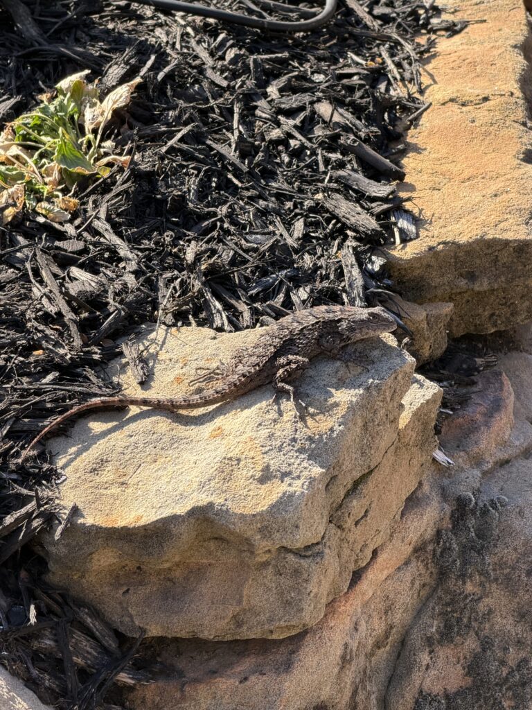 We noticed we have a new inhabitant, a fairly good size Texas Spiny Lizard who lives in the rocks around our patio water feature. He shall be called Rocky. Nothing like a warm sunny day to sun oneself.