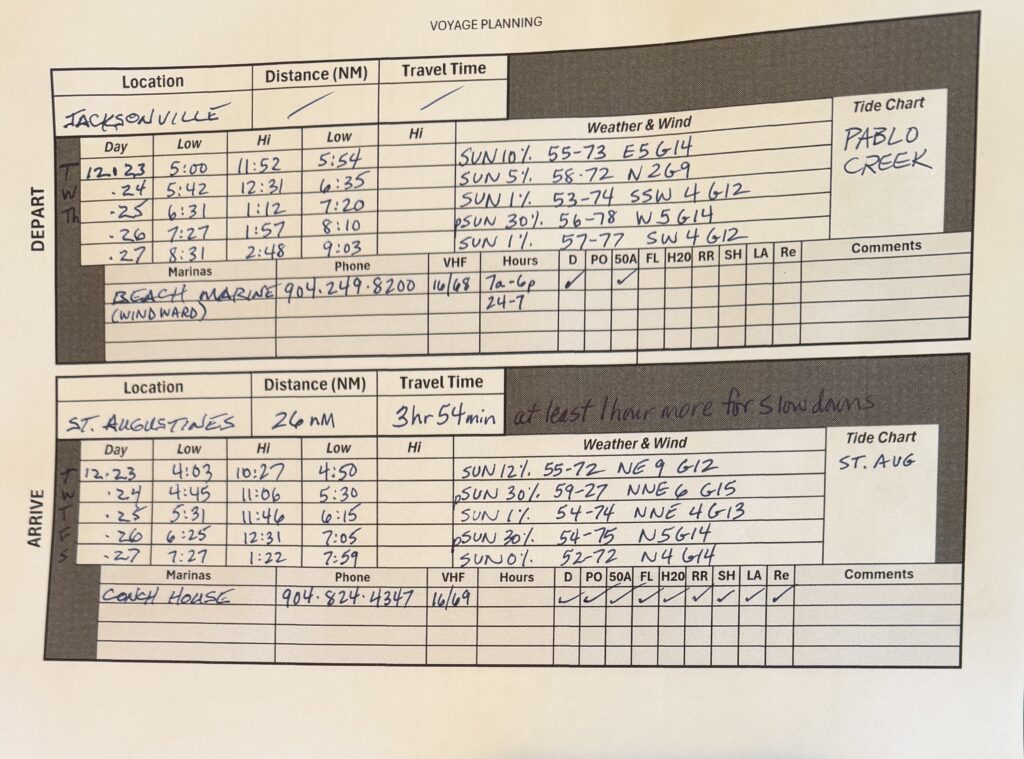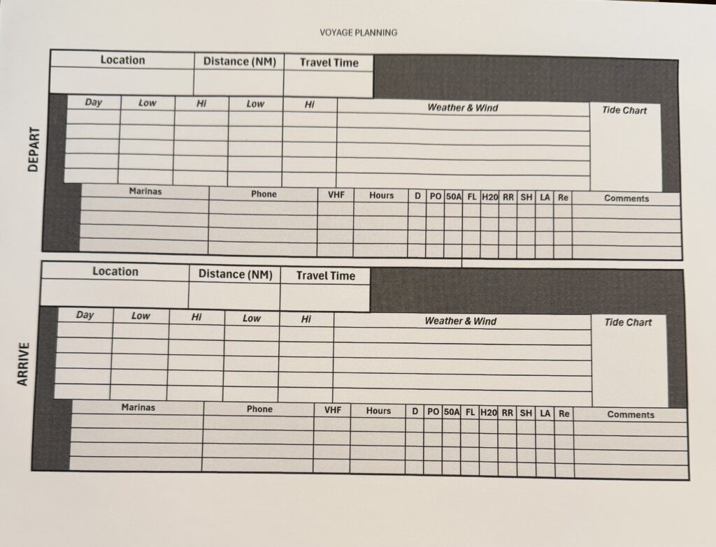 Being the Nerds that we are, we have a voyage planning process with a custom spreadsheet. It contains all the data we need to determine our next stop. Distance is only one aspect. The weather forecast (mostly rain and wind) as well as tides are important. Why are tides important? Do you remember taking a bath as a kid and how the water would flow from one end of the tub to the other when you moved around? Ocean tides similarly affect water depth and currents. We look up the Tide Chart for our current and target destinations so we know what departure and arrival times would be best (and worst). Marinas are unique with their layout and amenities. We use abbreviations to indicate Diesel (D), Pump Out of waste tank (PO), 50-amp electric service (50A), Floating docks (FL), Water source for freshwater tank refilling (H2O), Rest Rooms (RR), Showers (SH), Laundry (LA) and Restaurant on site (Re). These amenities are mostly apparent. We prefer floating docks due to tide swings. If the docks are floating, then they move along with the tide change and therefore the lines on the boat do not require adjusting. Middle of the night line adjustment ruins a good night’s sleep.