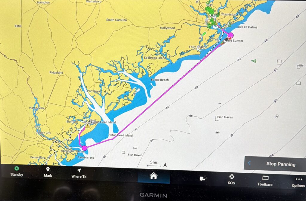 Our first destination is Hilton Head Island, and we can choose between the inside ICW route or Atlantic a few miles offshore. One takes longer given the slow speed “no wake zones” and many curves in the waterway. The other is much shorter but subject to waves and wind depending on the day. Being the fair-weather boaters we are, we waited for a weather window to take the outside route.