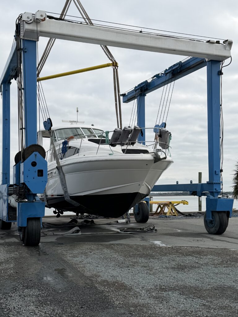 Boatyard activity starts well before the 10am appointment getting the travel lift in place and transitioning Nauti Nerds to the sling from the boat stands. She looks great with her new paint job and wash/polish!