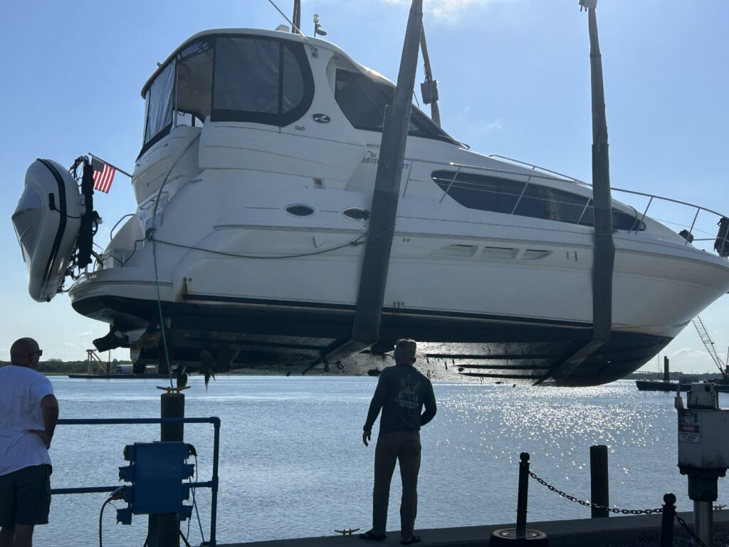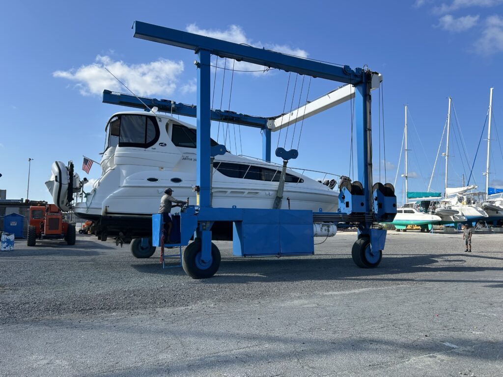 We arrived at Cooper River Boat Yard (CRBY) as planned, early on Monday June 23. They haul Nauti Nerds out of the water using a crane and transfer her to a travel lift.