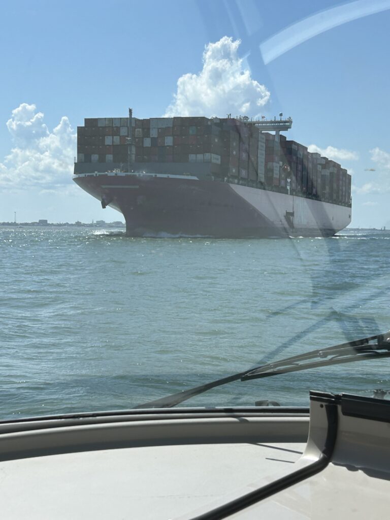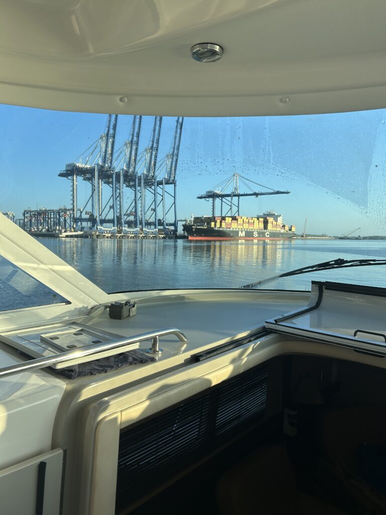 Our destination is the Cooper River Marina which is just south of the boatyard. Docking is a bit dicey since the marina is located between two 24 – 7 container ship load/unload stations. These ships are so huge they create incredible waves even at slow speeds. We got heavily “waked” overnight due to their wave movement. 😳