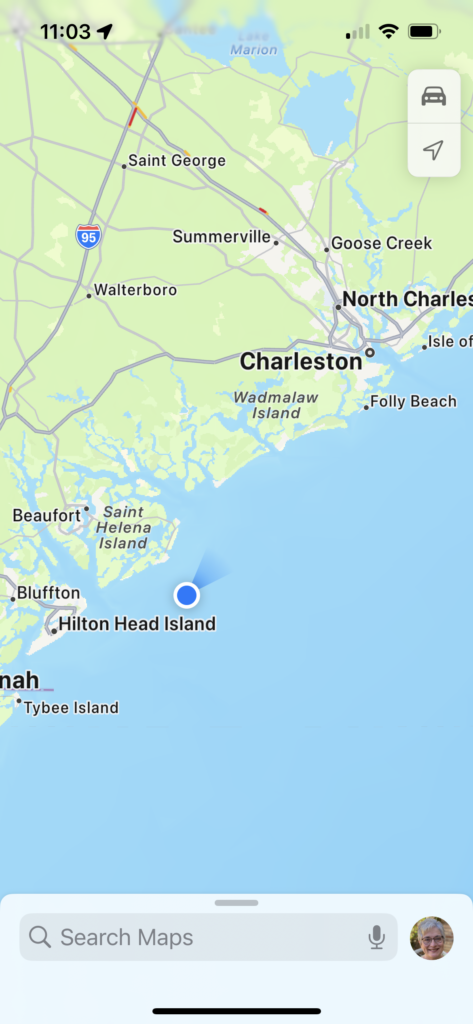 Cleo stays at Palmetto Beach Marina while we motor Nauti Nerds to the Charleston area. We complete the ~78 nautical miles in one day, choosing to go the “outside” route in the Atlantic (a few miles off shore) rather than take the slower and longer Intracoastal route.