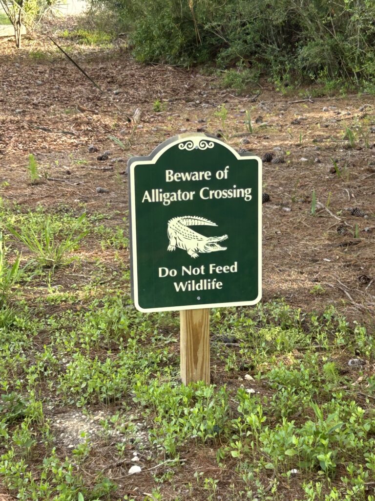 The island is a state park and highly regulated. There are no large signs and new construction restricted. It is a golf resort area and family friendly. Many inhabitants and visitors use bicycles and golf carts to navigate the island. We see our first wild alligator up close and signs to not feed/beware.