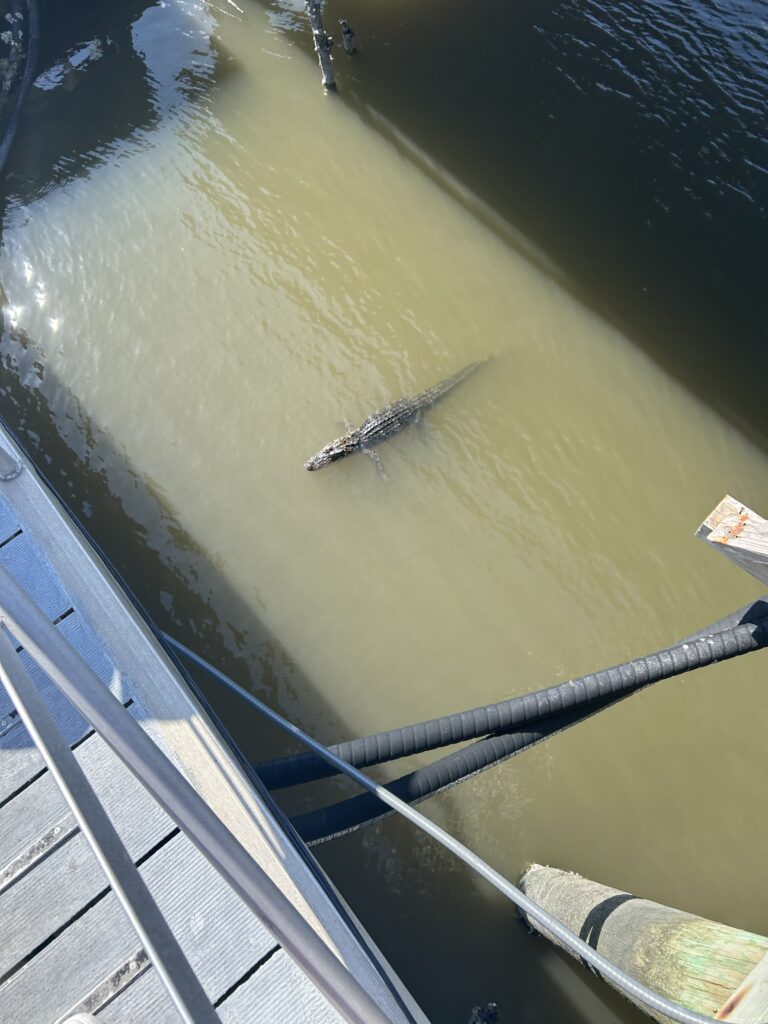 The Jekyll Harbor Marina is a 250ft linear dock which we anticipate being an simple approach. However it’s right before a 65ft bridge with some wicked strong current and there is boat traffic at the fuel dock. We had been in constant communication with the marina – both phone and VHF radio. They were expecting us and waiting for us at the fuel dock. We notify them we will wait for an oncoming boat to pass under the bridge before we approach since they will be generating current as they pass on by. Nope, they don’t pass by, they undercut us and pull up directly in front of us to the dock. The marina is shocked and so are we! This boater NEVER contacted the marina, just did what they wanted, picked out a spot and docked! Never a dull moment.