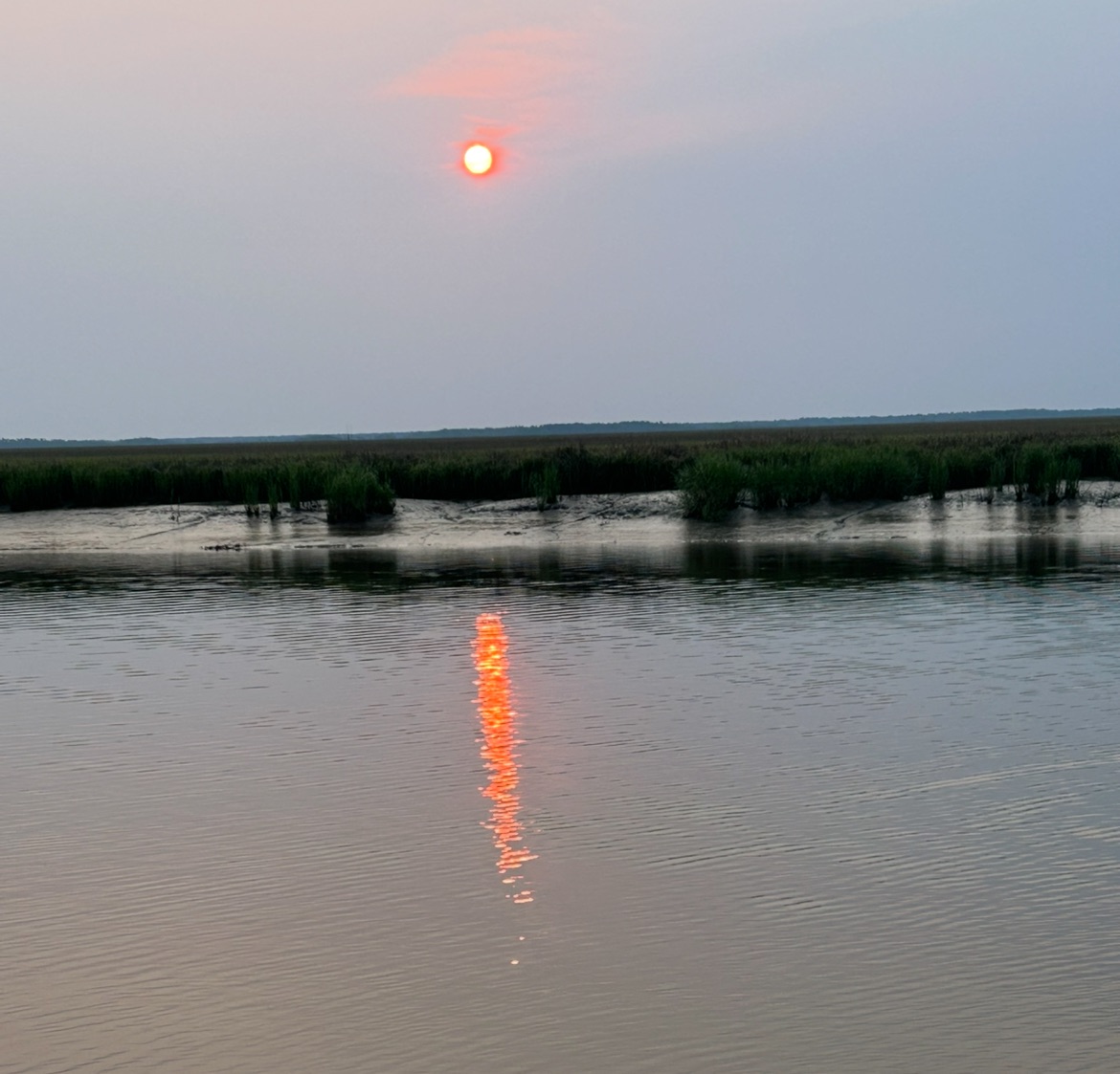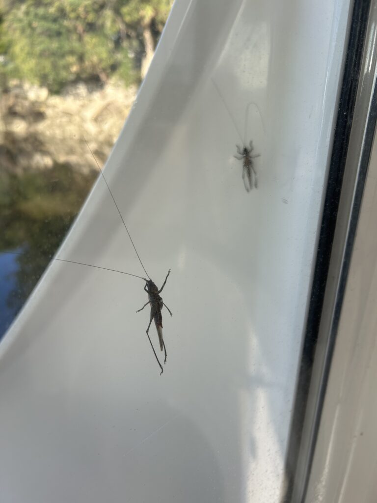 In the morning, we have cricket guests on the outside of our sundeck doors. 🦗 My welts are at maximum itch. Spray on calamine it is! Stuff is magical but I am taking antihistamines day and night to manage the damage these dang insects have inflicted! As long as I am around, Alan is safe 😉 and I thought it was true love!! Nope – I am insect repellant for him. 🤣 On the positive side, we are blessed with yet another spectacular sunrise.