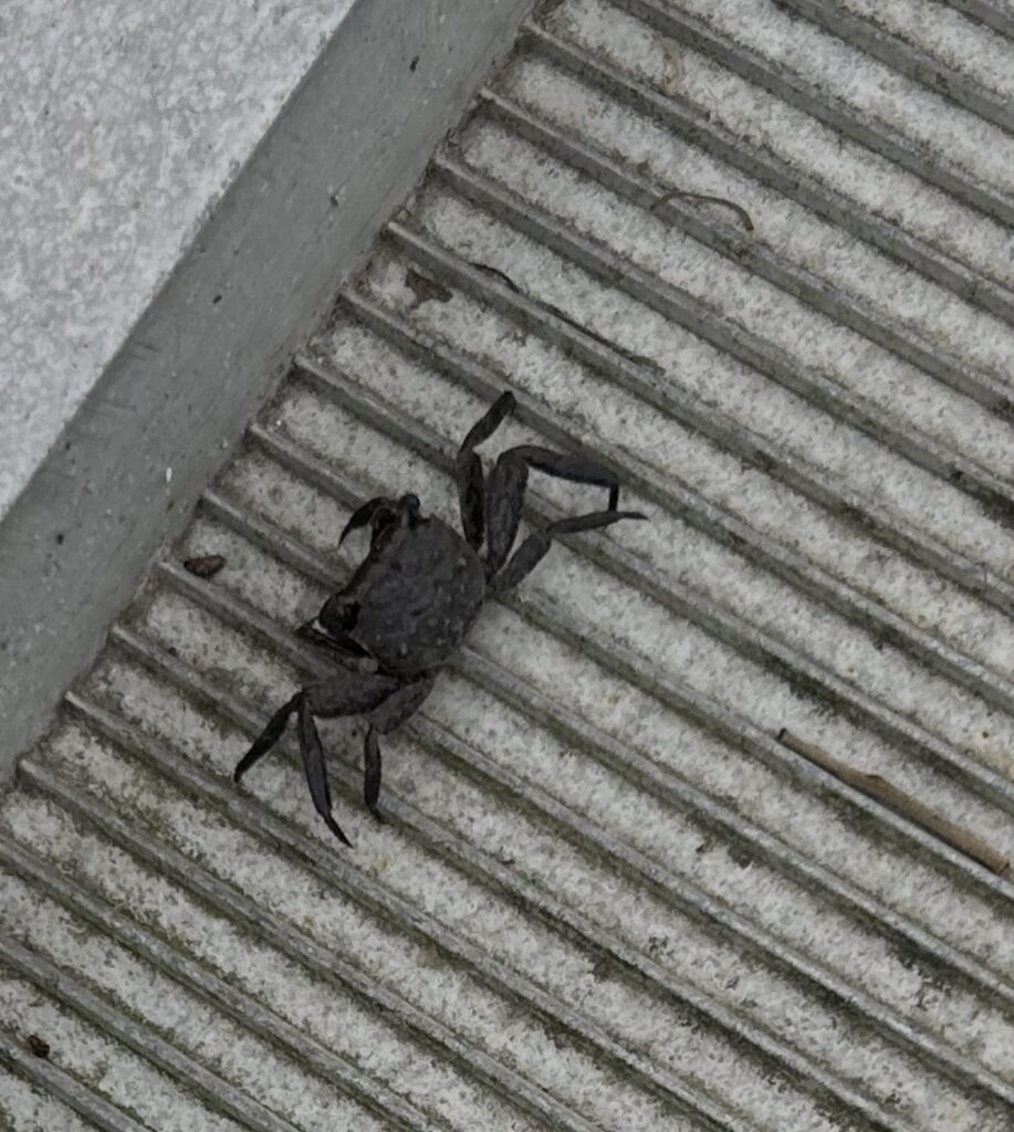 We feed the electric cable out and plug in to the dock pedestal, throw the breaker, switch to shore power and shut down the generator – our standard arrival procedure. On the way to the marina office we notice tiny sidewinder crabs. They quickly scurry when you approach. I was able to get a photo since there was nowhere for this little guy to hide. They are probably about an inch or so long.